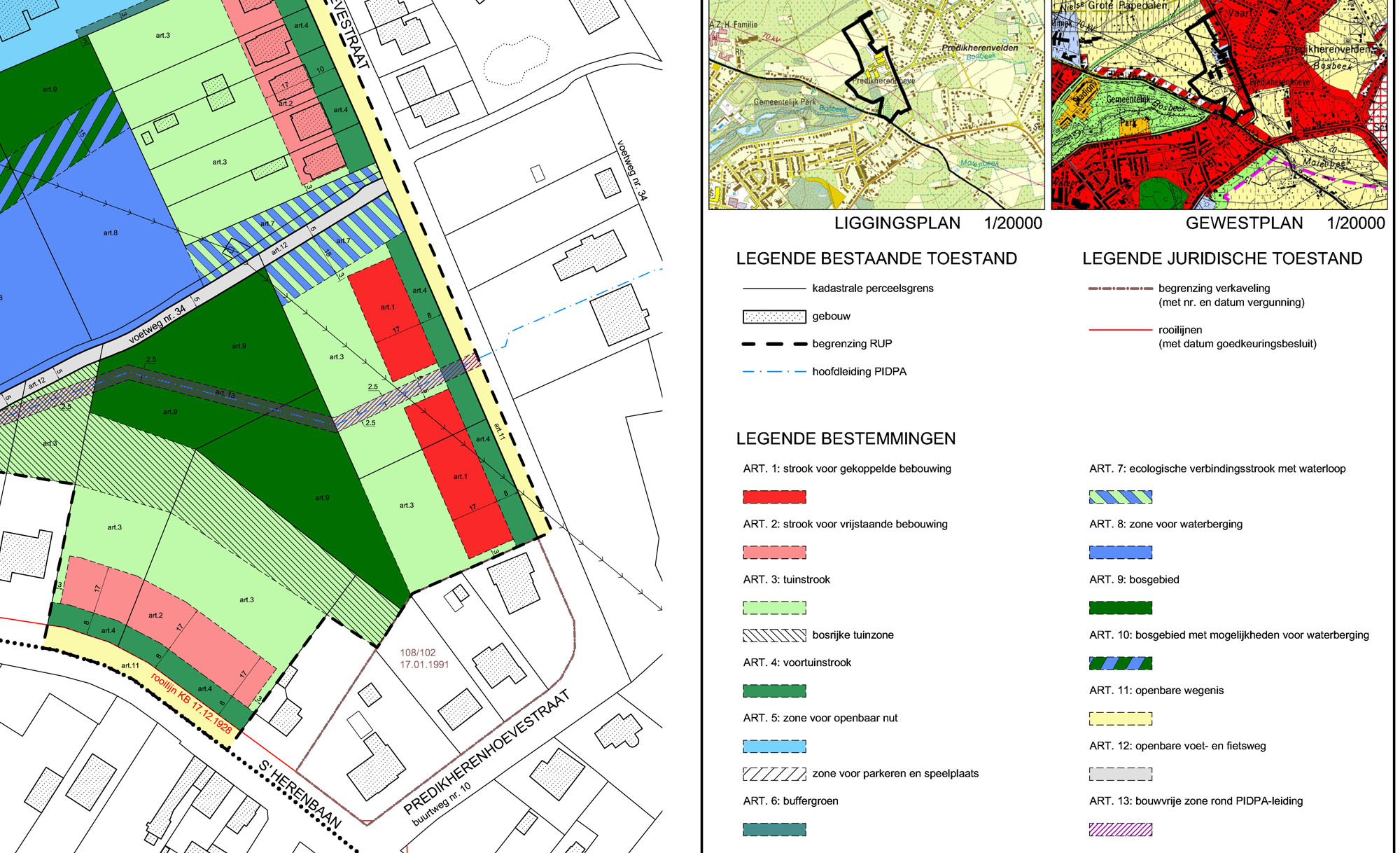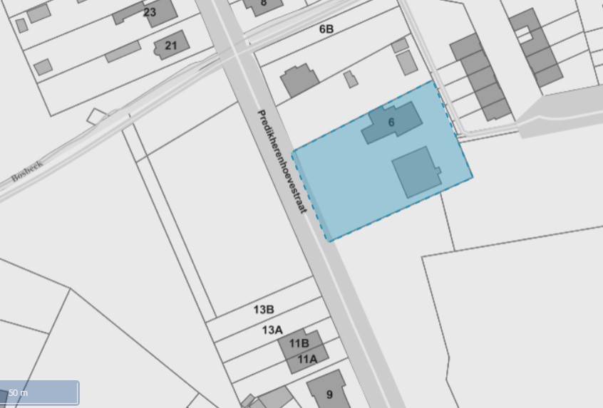 Aan de overzijde van de Predikherenhoevestraat bevindt zich zuidelijker dan straatnr. 6  landbouwgebied met agrarische bestemming volgens gewestplan.  Het vrije uitzicht over de zone ten zuiden van de 18e eeuwse kleine Predikherenhoeve is aldus door het Gewestplan beschermd. Aan beide zijden van de verkaveling in rood Woongebied bevinden zich (deels) gele agrarische gebieden.  De overzijde van de Prediherenhoevestraat valt op het grensgebied van de Bosbeek na niet onder RUP en is dus agrarisch gebied gebleven.