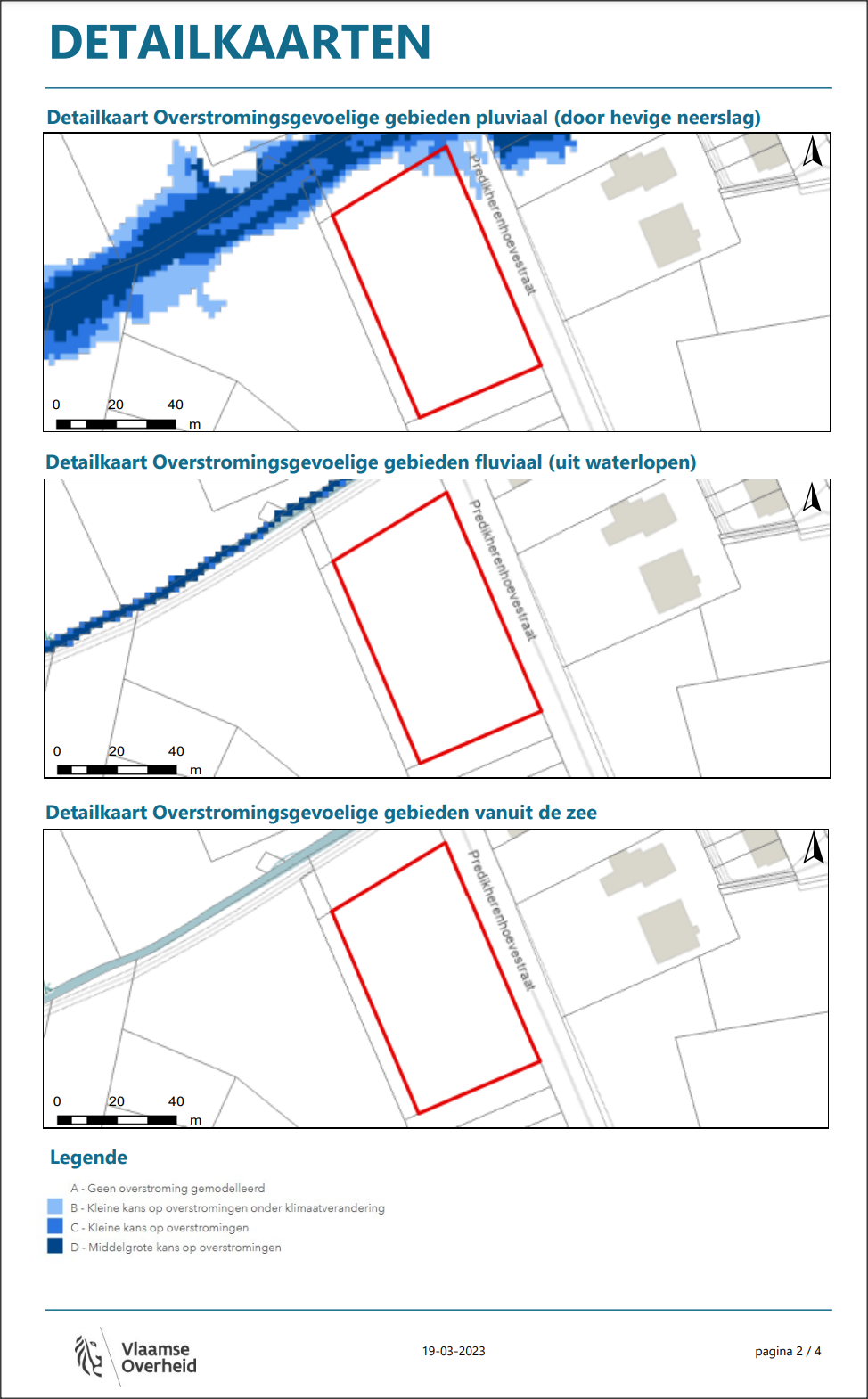 Op het overstromingsrapport van de watertoets blijkt alleen een klein risico op pluviale overstromingen van een deel van de de voortuin van Lot 7. Dit is een kleine pluviale overstromingskans - door intense neerslag - van 0,1% tot 1% naar huidig klimaat. Het perceel heeft aldus P -score C, een kleine kans op enkel pluviale overstromingen.
