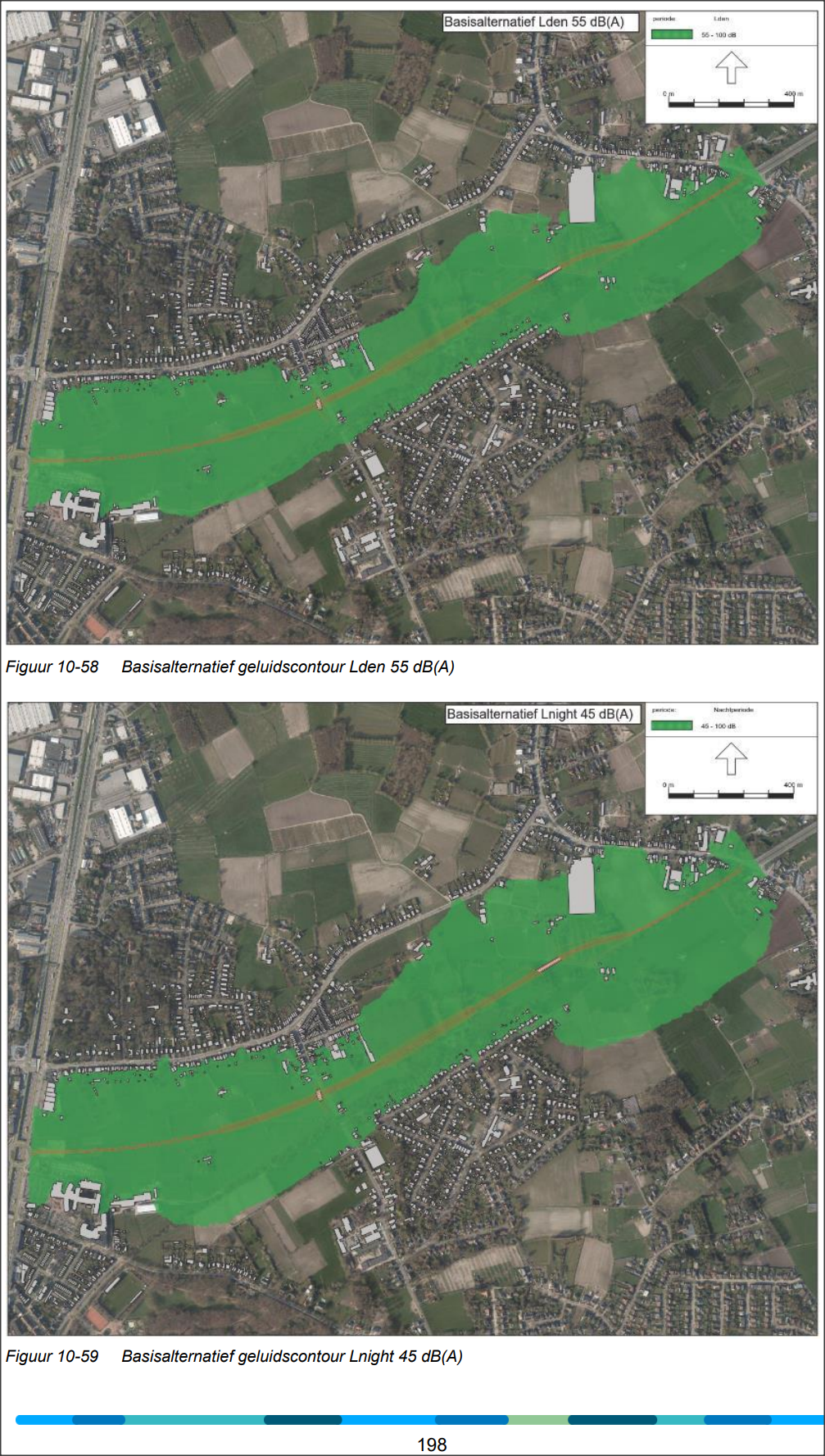 Hieronder vindt u de geluidscontour met geluid boven 55 dB overdag en 45 dB 's nachts veroorzaakt door autoverkeer op de in 2025 in gebruik genomen expresweg, zie MER op p. 198.
