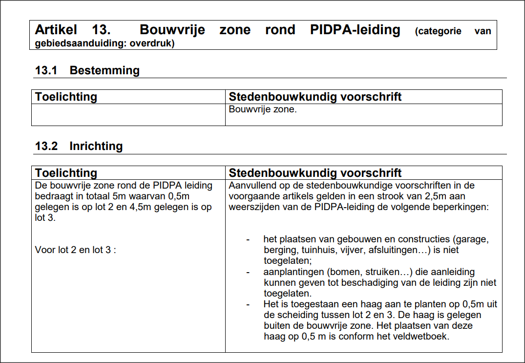 Over dit lot 2 loopt geen enkele erfdienstbaarheid ten laste van lot 2 ten voordele van Pidpa. Pidpa kan niet vragen om de levende haag te verwijderen, te inspecteren, kan geen recht van overgang vragen,... U hebt aldus het volledige ongestoorde genot van deze bouwvrije strook. Natuurlijk mag u op deze strook van 0.5 meter niet bouwen of bomen planten, constructies of afsluitingen oprichten, etc... zie verkavelingsvoorschriften en RUP in artikel 13.
