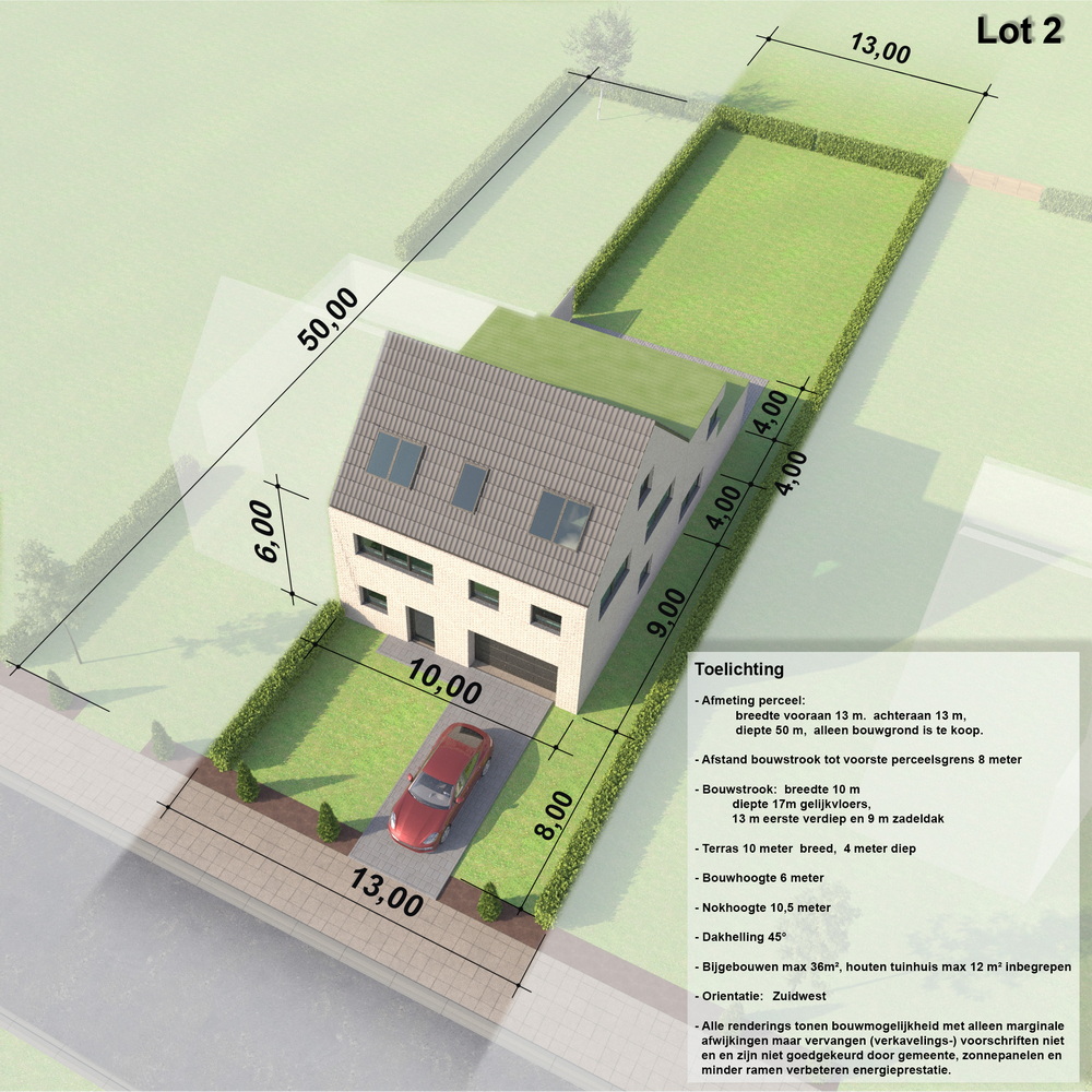 - Uit de achtergevel: terrassen, balkons op minimum 2m afstand van elke perceelsgrens; erkers zijn verboden.