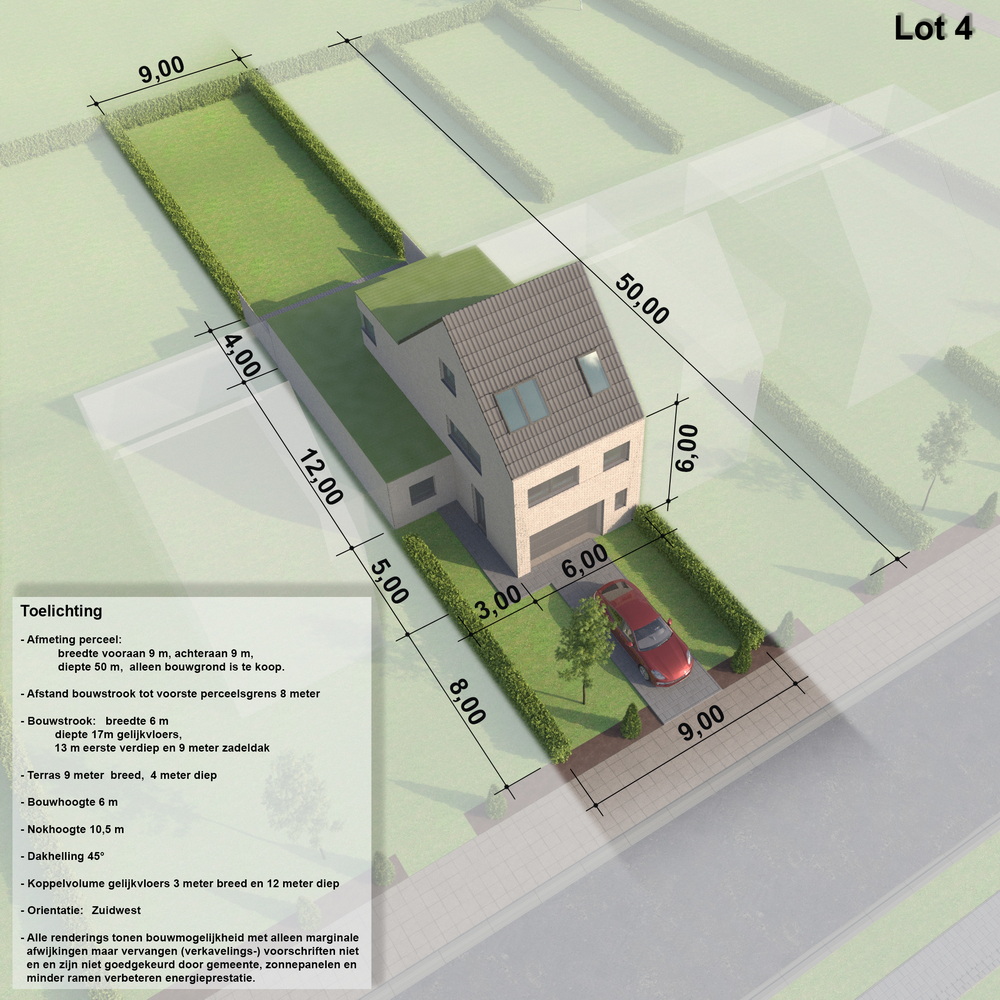 - Uit de achtergevel: terrassen, balkons op minimum 2m afstand van elke perceelsgrens; erkers zijn verboden.