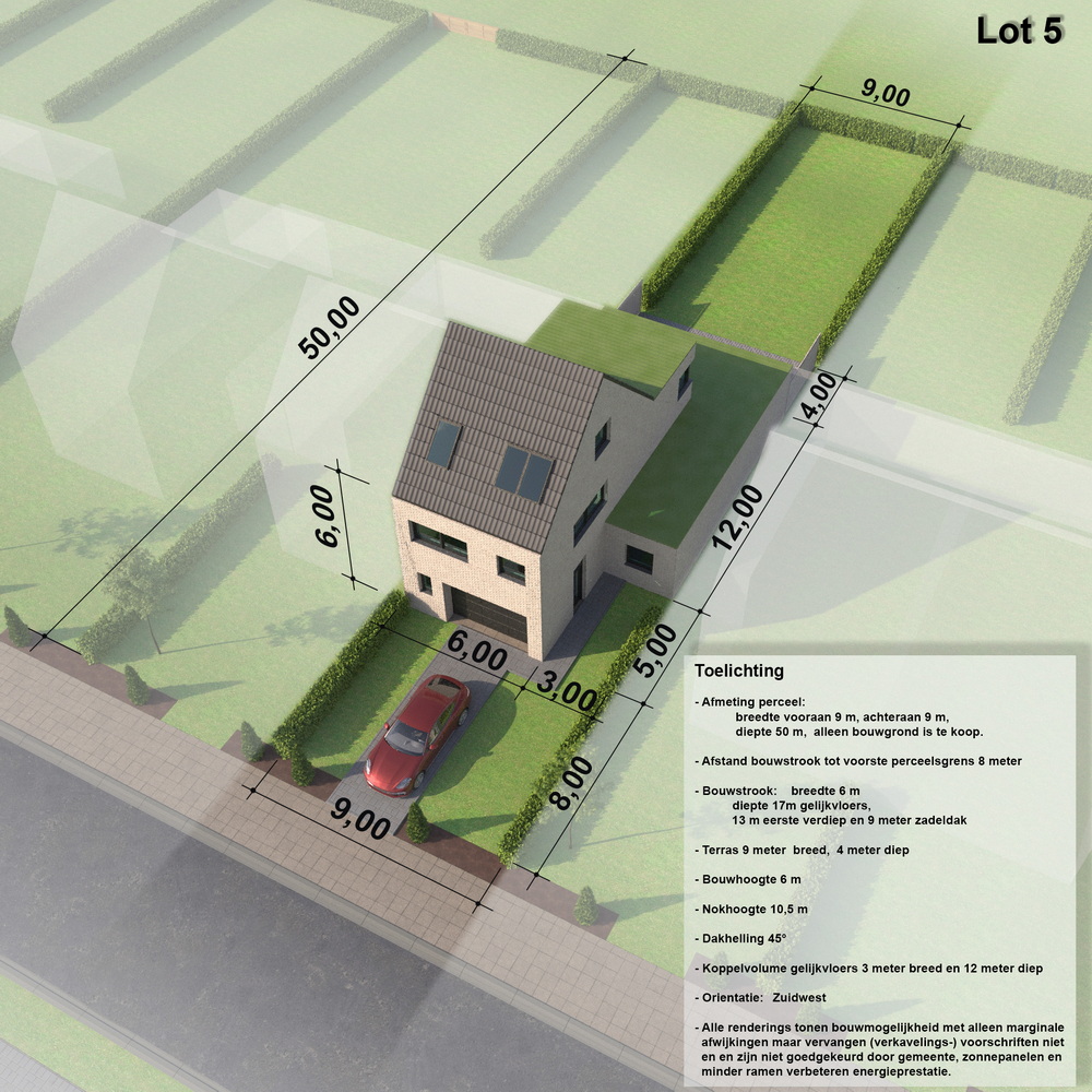 - Uit de achtergevel: terrassen, balkons op minimum 2m afstand van elke perceelsgrens; erkers zijn verboden.